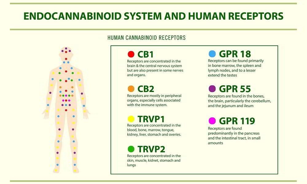 - CB1 – występują głównie w mózgu, układzie nerwowym i tkankach metabolicznych; nadaktywność może prowadzić do stanu zapalnego i śmierci komórek β.